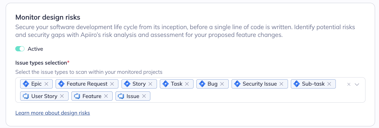 Connect your organization’s ticketing system with Apiiro to automatically pull relevant tickets and issues. Apiiro supports popular systems like Jira, GitHub Issues, Azure DevOps Boards, etc. to streamline the process of identifying risks at the design phase.