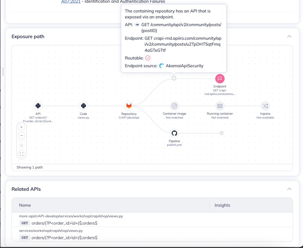 Apiiro Code-to-Runtime matching connects these dots. By correlating the runtime traffic code definitions, Apiiro recognizes that this “internal” function is actually receiving direct public traffic. It can automatically escalate the vulnerability to Critical, alerting you that a SQL injection is live and exposed to the internet, despite what the code annotations might suggest.