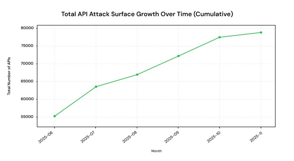 Between June and October 2025, API surface records grew from 54,627 to 79,630 (+44%), representing 53,598 unique API definitions in code across 2,033 repositories. Of these, 72.5% are internal controller actions while 27.5% (14,743) are REST-style HTTP endpoints. This represents a roughly 40% increase in the attack surface in under six months.