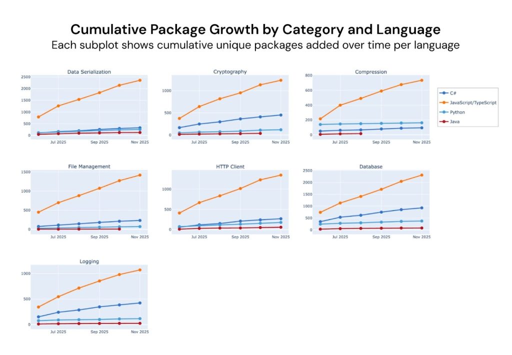 This analysis of 4.7 million OSS package records across 9,352 repositories reveals a concerning trend: organizations are experiencing significant package sprawl, where multiple packages perform the same function and dramatically expand the attack surface.