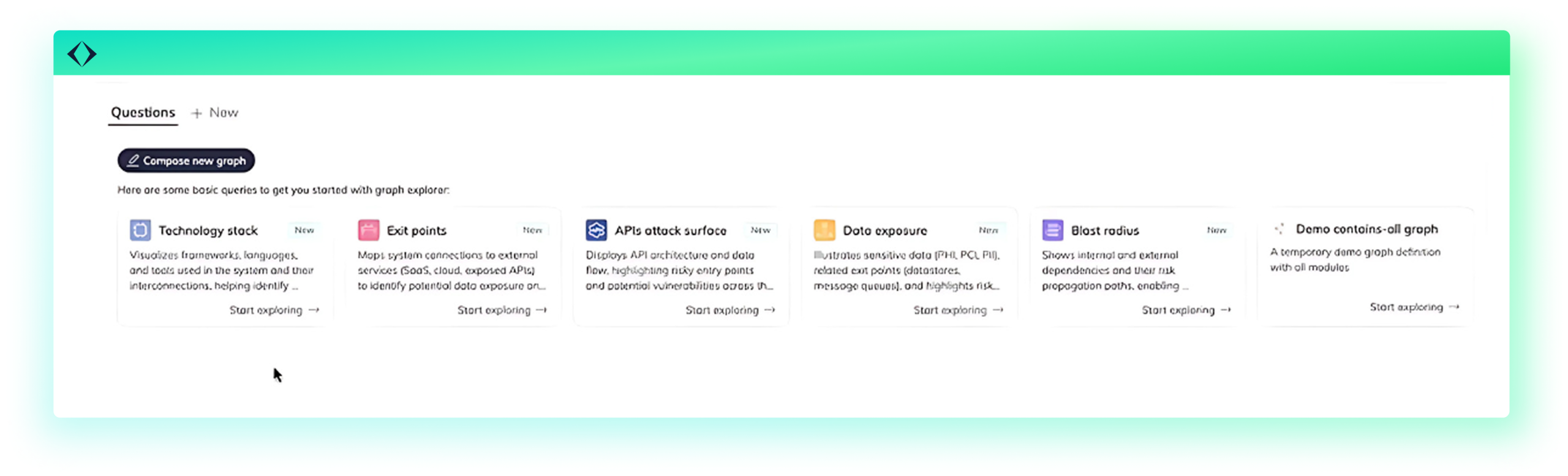 Pre-built, actionable views tailored to key security workflows, such as attack surface analysis, API risk exposure, penetration testing scoping, and compliance reporting (e.g., FedRAMP). Each graph surfaces only what’s relevant, helping teams cut noise, focus on what matters, and accelerate remediation.
