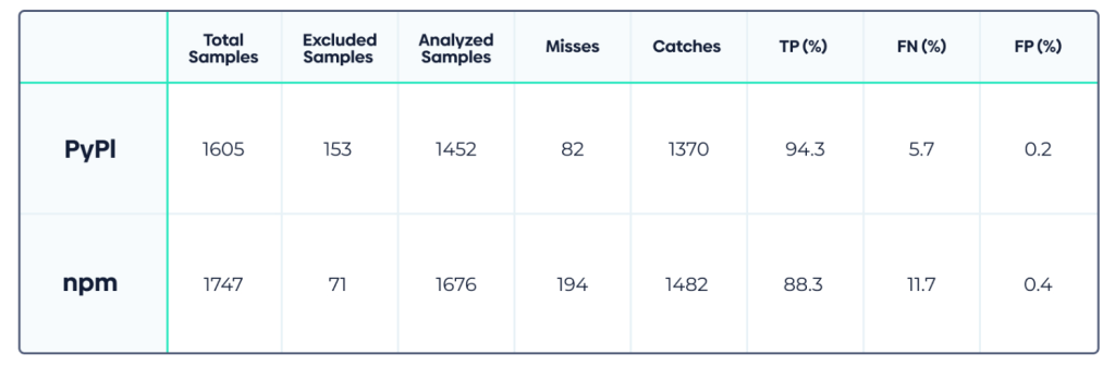 Our detection achieved a 94.3% success rate in PyPI and 88.4% in npm. This makes these anti-patterns a baseline for detection, even if considering a potential dataset survivorship bias.