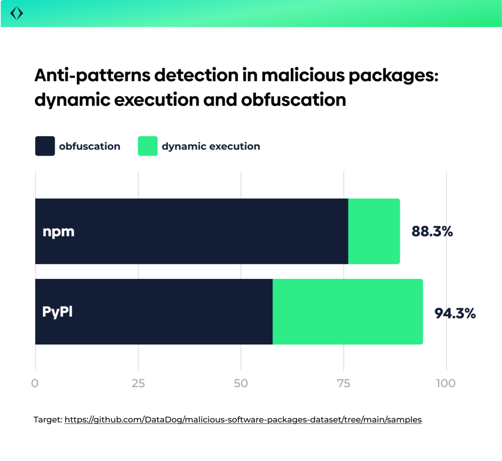 We found that most attacks hide their malicious nature by using a small set of coding anti-patterns. Note the emphasis on ‘anti’; some malicious patterns are common in legitimate code and would cause false-positives (e.g., command-execution patterns). However, we focus on coding anti-patterns – patterns that go against best practices, are rare in typical codebases, but common in malicious code.