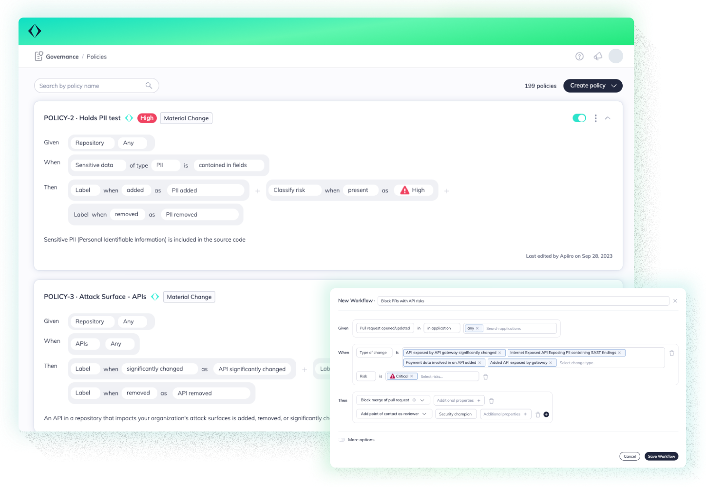 - Apiiro gives AppSec teams the power to define thresholds for what should block a release, helping to minimize unnecessary friction over low-impact alerts.