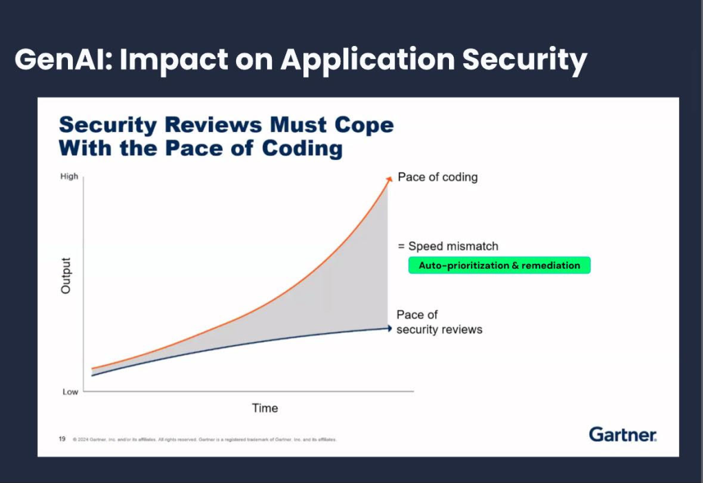 The SANS Institute’s State of Application Security survey results revealed that only 26% of organizations perform security testing during the development phase. The majority of organizations do not perform security testing during the design and development phase. Shown below, there is a disconnect between the pace of coding and the pace of security reviews. Using AI-driven security review during the design phase will aid in the prioritization of Secure by Design.