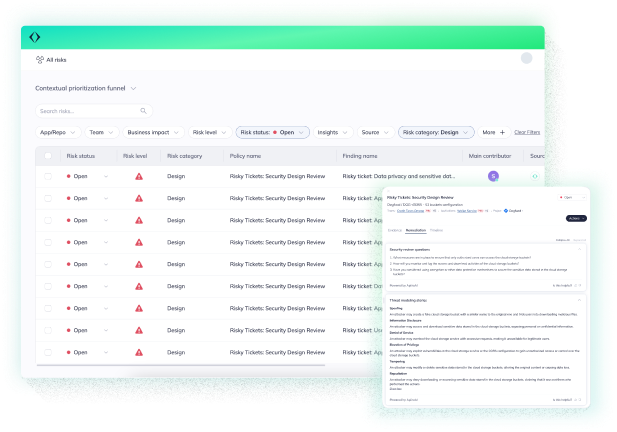 Apiiro’s private LLM model automatically parses feature requests, architectural designs, and ticketing systems to detect risk vectors before code is written. This minimizes security debt, optimizes resource allocation, and reduces the complexity of runtime remediations.